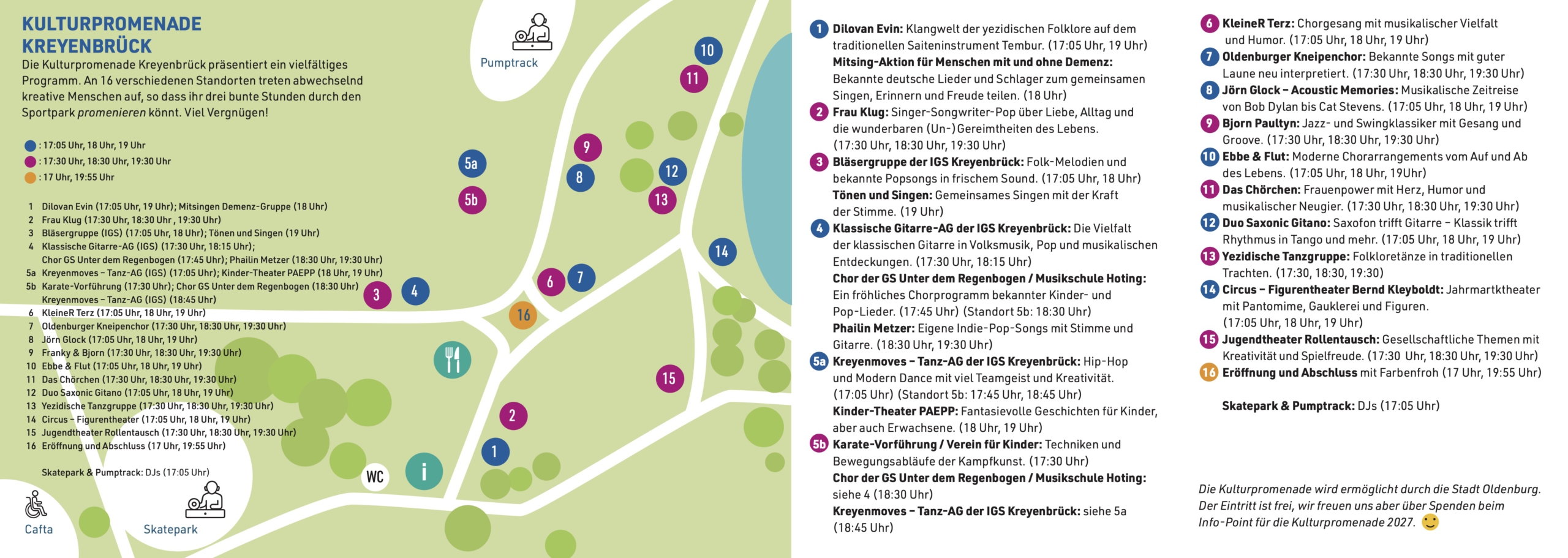 Die Kulturpromenade Kreyenbrück präsentiert ein vielfältiges Programm. An 16 verschiedenen Standorten treten abwechselnd kreative Menschen auf, so dass ihr drei bunte Stunden durch den Sportpark promenieren könnt. Viel Vergnügen!